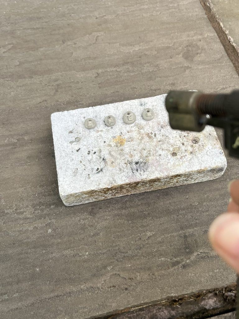 Place the silver clay charms on a soldering block and heat using a handheld blow torch. Burn off the binder and then torch fire following the instructions included with the silver clay. Leave the silver clay to completely cool before handling.