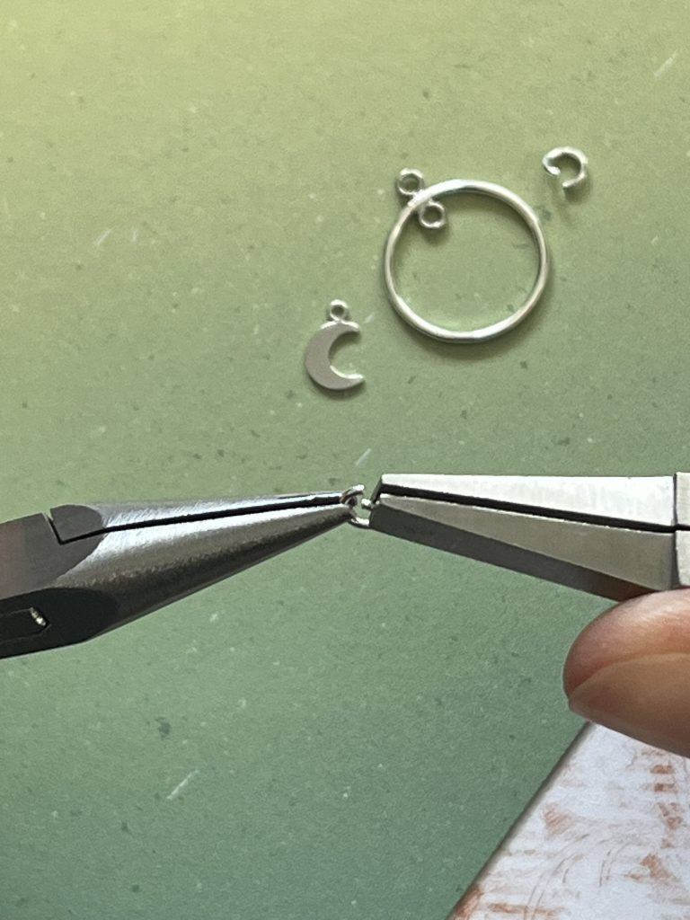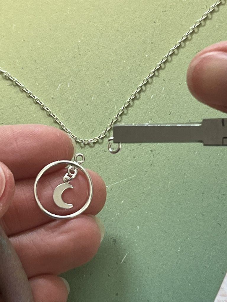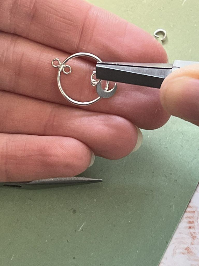 Repeat the same process, opening a jump ring, threading on the hoop and moon and attaching it onto the chain. Close the jump ring.
